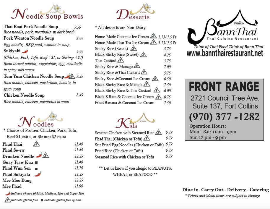 Bann Thai Restaurant, located in Fort Collins, offers a variety of Thai dishes with options for vegans and vegetarians. The restaurant provides takeout, delivery, and catering services, making it convenient for customers. Reviews highlight the delicious yellow curry and chicken panang dishes, as well as the generous portions. While some reviewers had mixed feelings about the pad thai, overall, the food is described as flavorful and satisfying. The cozy ambiance and attentive service add to the dining experience. Whether you're a fan of spicy soups, savory curries, or classic pad thai, Bann Thai Restaurant promises a memorable culinary adventure. Be sure to stop by and indulge in the flavors of Thailand at this casual yet classy establishment.