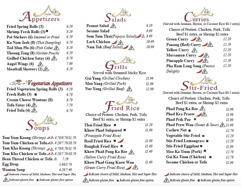 Gluten-free, spicy. Choice of meat, mussaman curry paste, coconut milk, carrot, potato, onion, peanut.